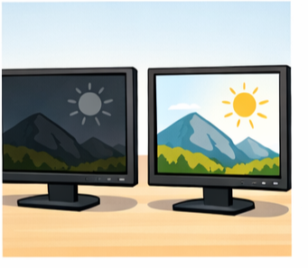 눈에 편안한 컴퓨터 모니터 화면 밝기 조정을 위해서는 주변 환경을 함께 고려해야 합니다. 밝은 낮에는 화면이 상대적으로 어둡게 느껴질 수 있고, 어두운 밤에는 같은 밝기도 눈부시게 느껴집니다.