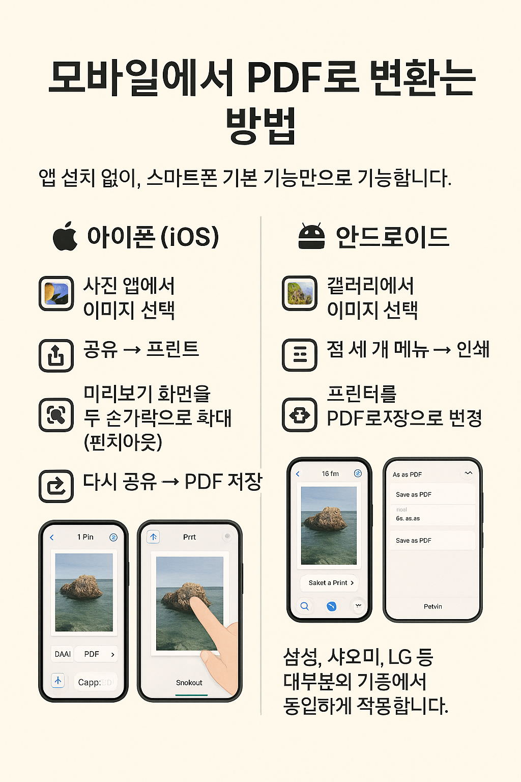 - 아이폰: 공유 → 프린트 → 핀치 확대 → PDF 저장