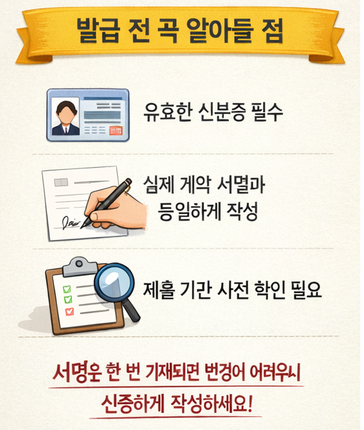 또한 준비 과정에서도 차이가 있습니다. 인감증명서는 사전 등록이 필수지만, 서명 확인 문서는 별도의 준비 절차 없이 즉시 발급이 가능합니다. 갑작스럽게 서류가 필요한 상황에서는 훨씬 실용적입니다.
