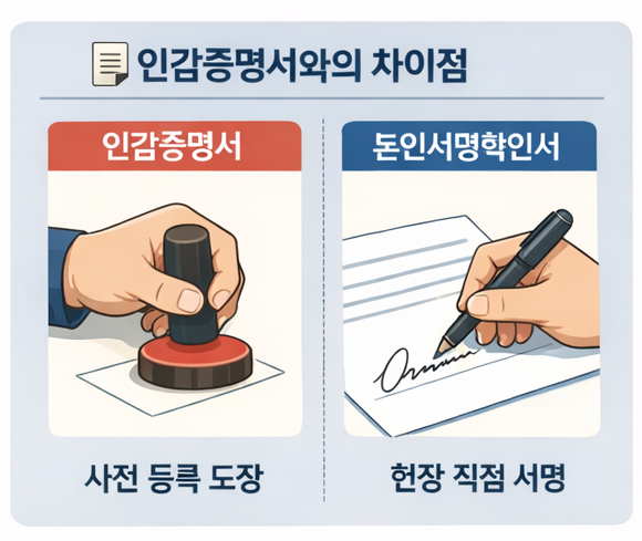 인감증명서는 사전에 등록한 도장을 기준으로 하지만, 이 서류는 현장에서 직접 서명함으로써 본인 확인이 이뤄집니다.