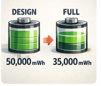 예를 들어 설계 용량이 50,000mWh이고 현재 최대 용량이 35,000mWh라면, 배터리 성능은 약 70% 수준으로 감소한 상태라고 볼 수 있습니다.