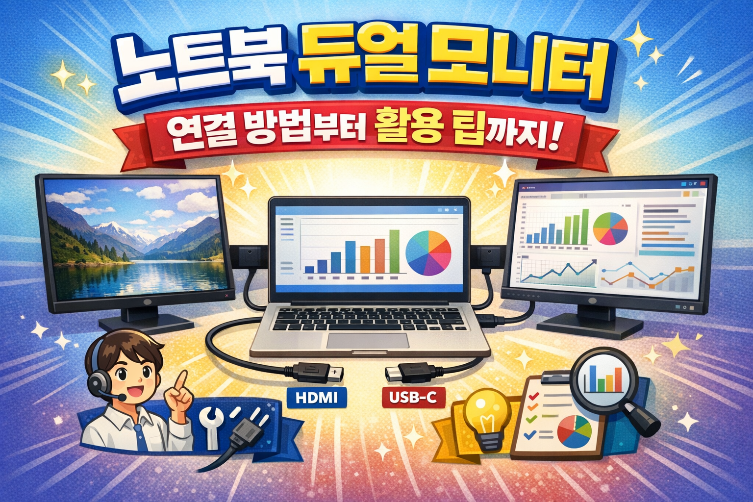 노트북 모니터 2개 연결은 단순히 화면을 늘리는 것이 아니라, 집중력과 생산성을 함께 끌어올리는 환경 구성입니다. 본인의 노트북 포트 구성에 맞는 방법으로 듀얼 모니터 환경을 완성해 보시길 바랍니다.