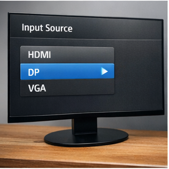 모니터 메뉴 버튼을 눌러 현재 입력 소스가 HDMI 또는 DP 등 사용 중인 케이블과 일치하는지 확인해 주세요.