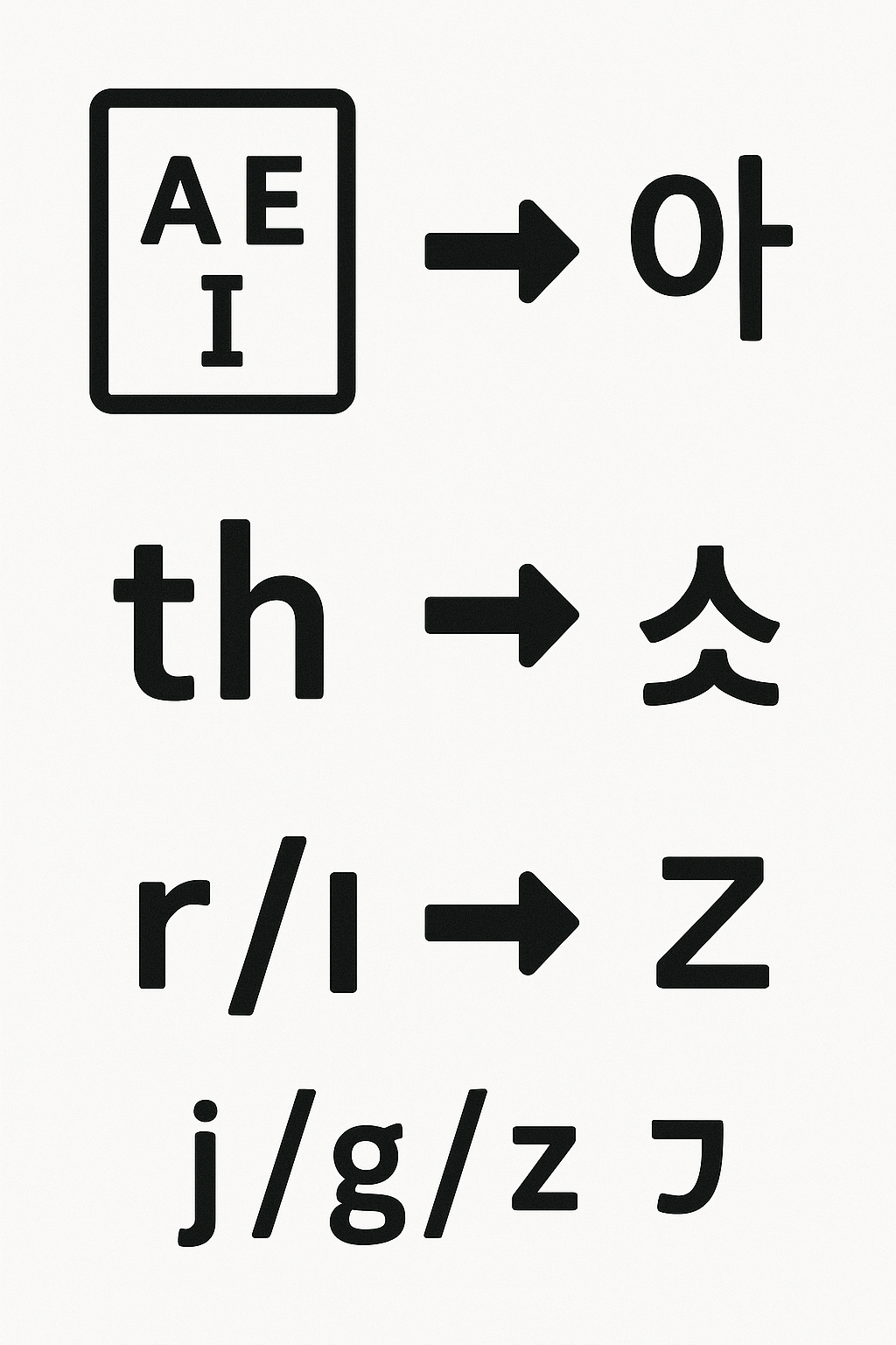 → 영어에서는 다른 음이지만, 한국어에서는 대부분 ‘ㄹ’로 표기합니다. - j / g / z
