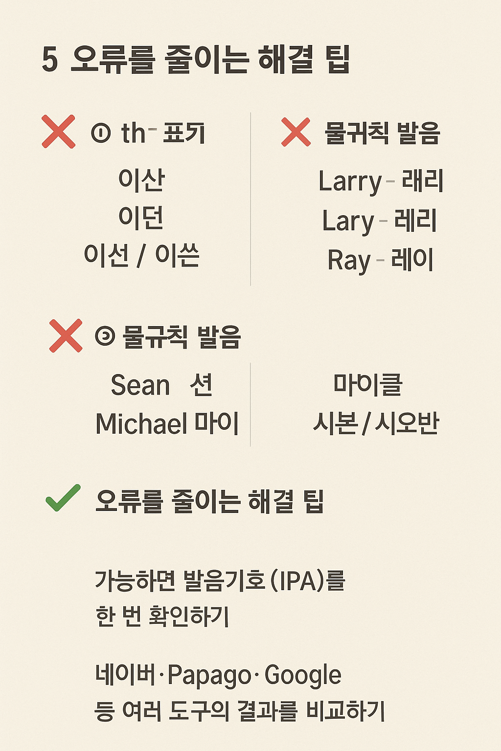 영문 이름을 한글로 자동 변환할 때 가장 자주 등장하는 오류 유형과, 이를 피하는 팁을 정리해 보겠습니다.