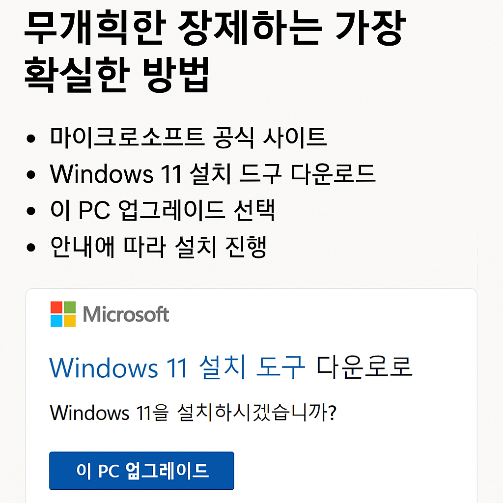 여러 방법을 시도했음에도 실패한다면, Media Creation Tool(설치 도구)을 이용해 강제 업그레이드하는 것이 가장 확실합니다.