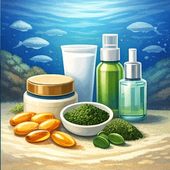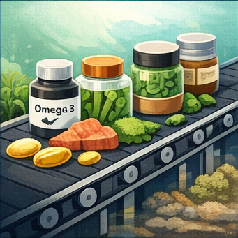 식품·건강기능식품 분야에서는 해조류 추출물, 오메가3 원료, 항산화 성분 등이 활용됩니다. 최근에는 친환경 단백질 대체 소재 개발도 활발히 진행되고 있습니다.