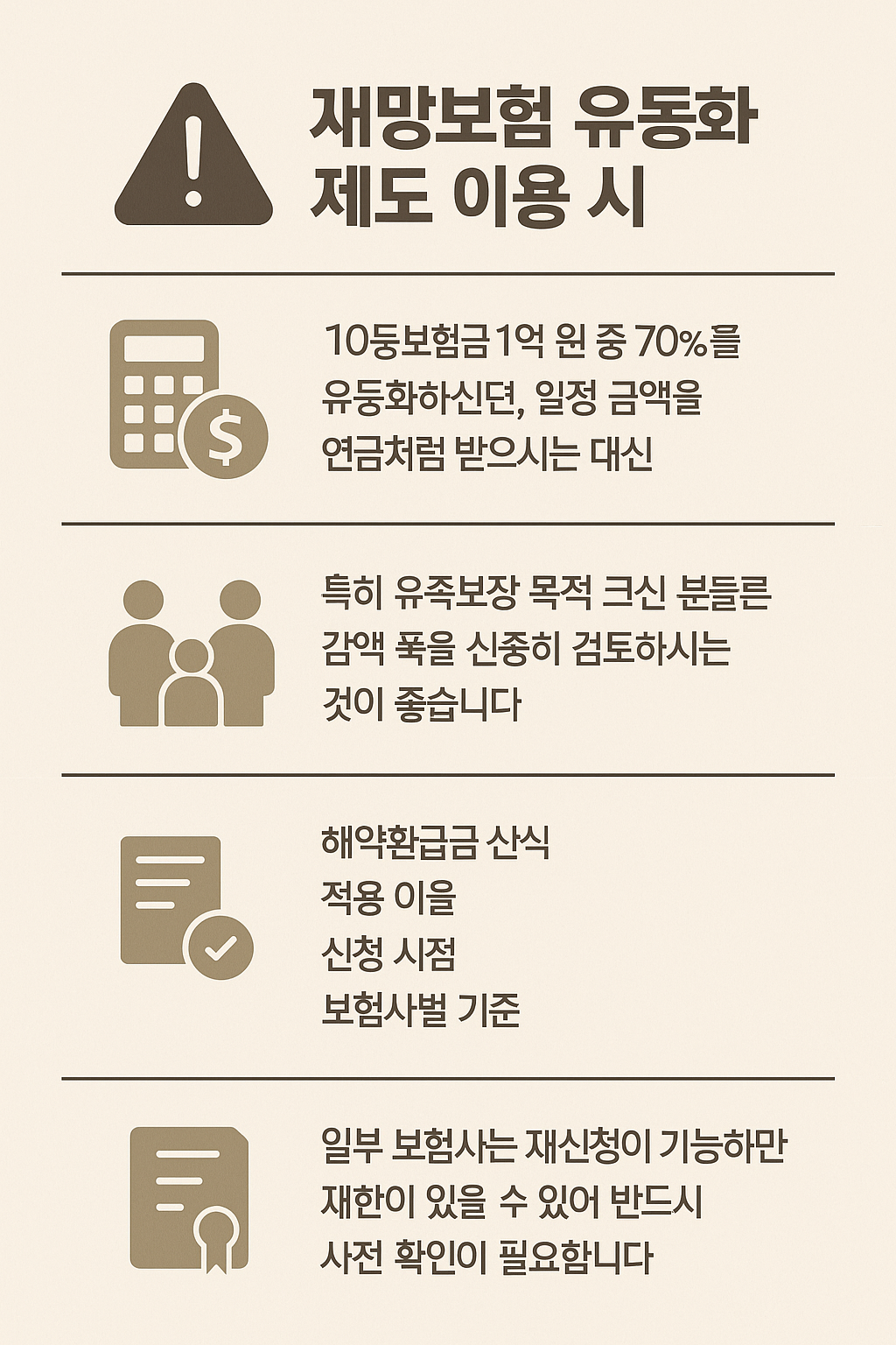 다만 보장 축소, 세금, 보험사별 기준 차이 등이 존재하므로, 유동화 금액과 연금 구조를 충분히 이해한 뒤 신청하시는 것이 가장 바람직합니다.