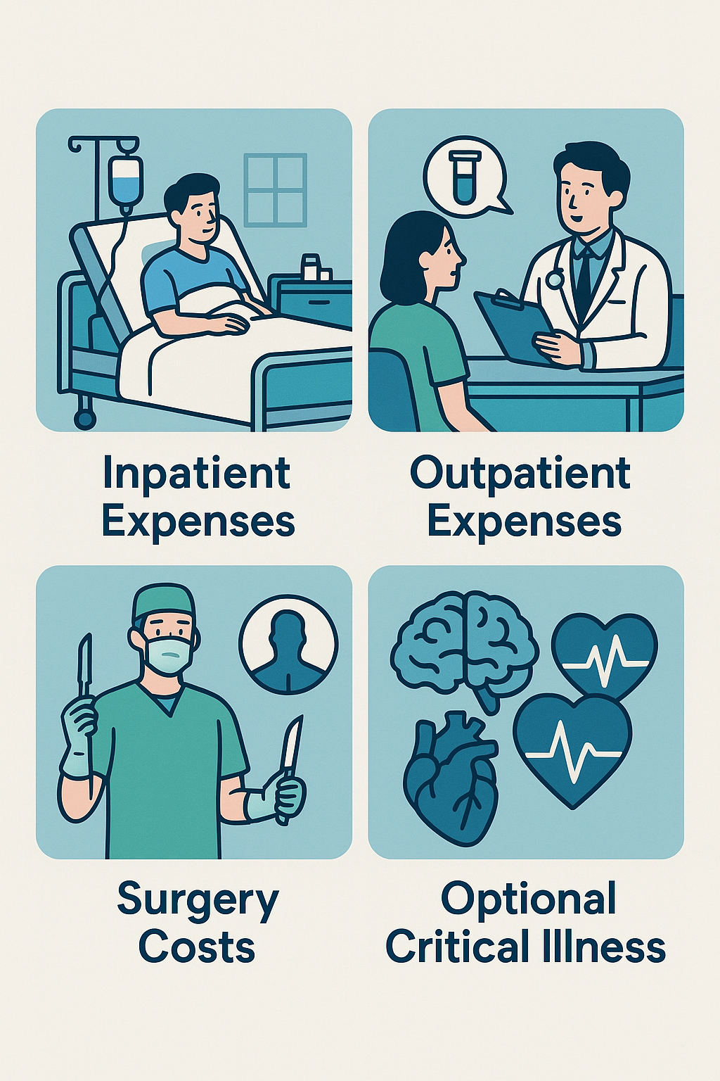 입원 시 발생하는 병실료, 식대, 기본 검사 및 진료비 등을 일정 한도 내에서 지원합니다. 갑작스럽게 입원하게 되더라도 경제적 부담을 크게 줄일 수 있습니다.