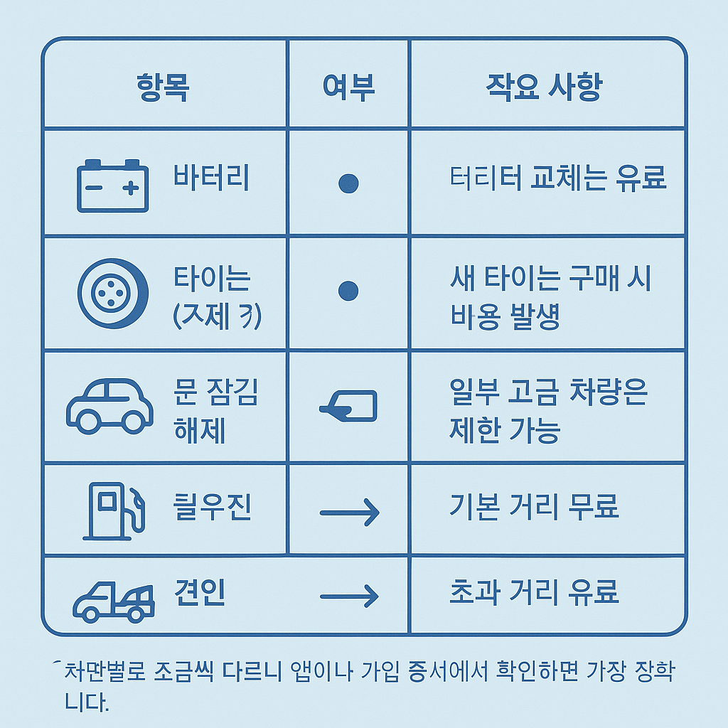자동차보험에 기본으로 포함되는 경우가 많아 부담 없이 이용할 수 있고, 대부분의 항목은 무료 범위 내에서 처리됩니다.